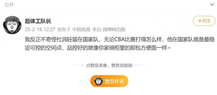 2月16日讯 今天,男篮15人名单出炉,杜润旺成功留队。媒体人@后体工队长发微博对此发表看法,他写道:“我反正不奇怪杜润旺留在国家队,无论CBA比赛打得怎么样,他在国家队就是最稳定可控的空间点,品控好的就像你家碗柜里的那包方便面一样~” 本文标签: CBA 中国篮球 篮球 中国男篮 广东