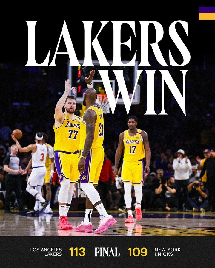 赛后湖人官方晒出本场赢球海报,詹姆斯、东契奇和芬尼-史密斯登上封面。