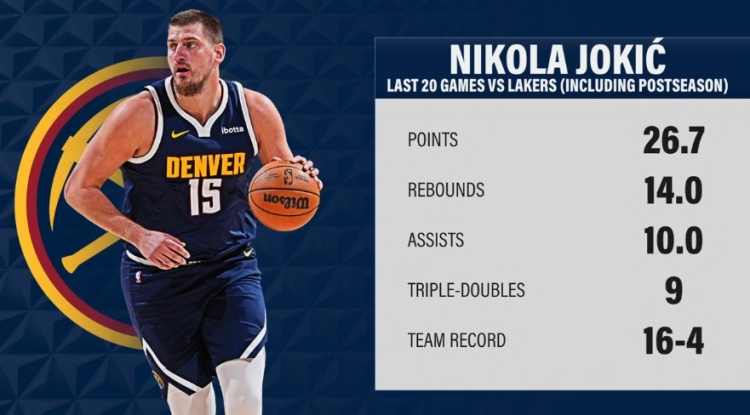 约基奇过去20场对阵湖人:场均26.7分14板10助&9次三双 16胜4负