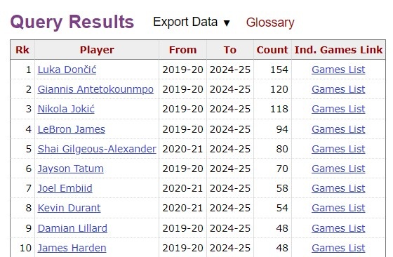 2020年以来的30+5+5场次榜单:东契奇155场居首 字母哥120场第2