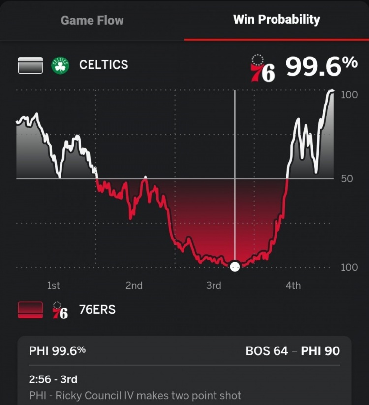 2月3日讯 NBA常规赛,凯尔特人118-110逆转战胜76人。比赛第三节还剩2分56秒时,76人一度领先26分。ESPN数据预测显示,76人当时赢球概率高达99.6%。 本文标签: 篮球 NBA 76人 凯尔特人