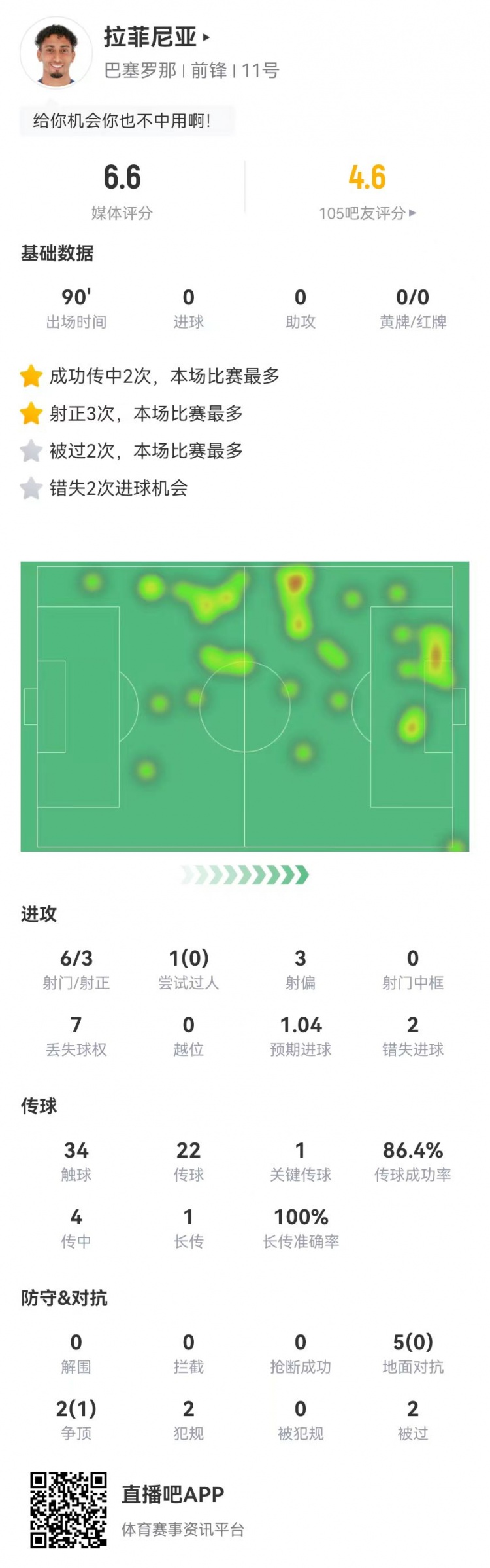 2月18日讯 巴萨在本轮西甲1-0险胜巴列卡诺,拉菲尼亚本场数据如下:首发踢满全场预期进球1.0434触球22传球、19成功,成功率86%1关键传球4传中、2成功1长传、1成功6射门、3射正1过人、0成功2错失重大机会7对抗、1成功7丢失球权2犯规2被过获评6.6分 本文标签: 足球 西甲 巴塞罗那 巴列卡诺