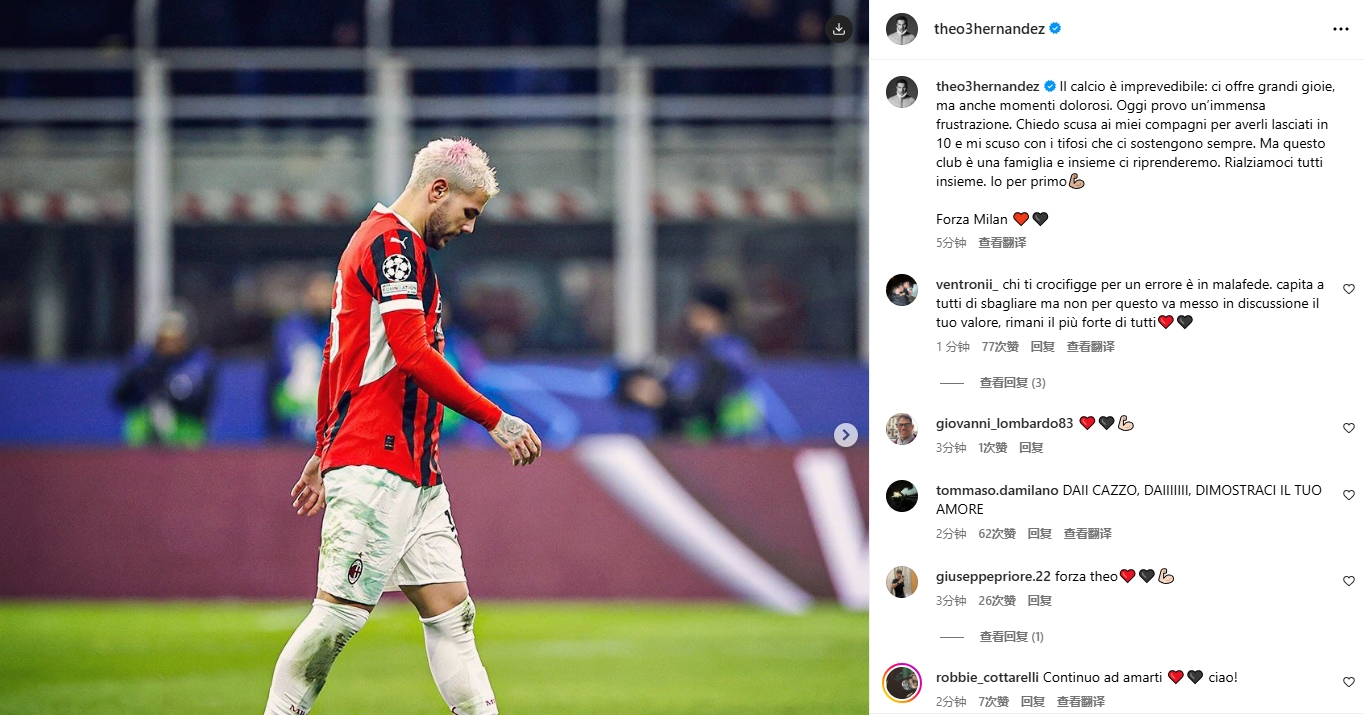 02月20日讯 欧冠附加赛次回合,特奥假摔染红,米兰遭费耶诺德淘汰。特奥发文致歉。特奥:“足球是不可预测的,它带给我们巨大的快乐,也有痛苦时刻。今天我感到无比的沮丧。我向我的队友们道歉,因为我让他们只剩下10个人作战。我也向一直支持我们的球迷们道歉。但这个俱乐部就像是一个大家庭,团结一致我们会恢复的。让我们一起重新站起来,从我开始。????????” 本文标签: 足球 意甲 AC米兰 欧冠