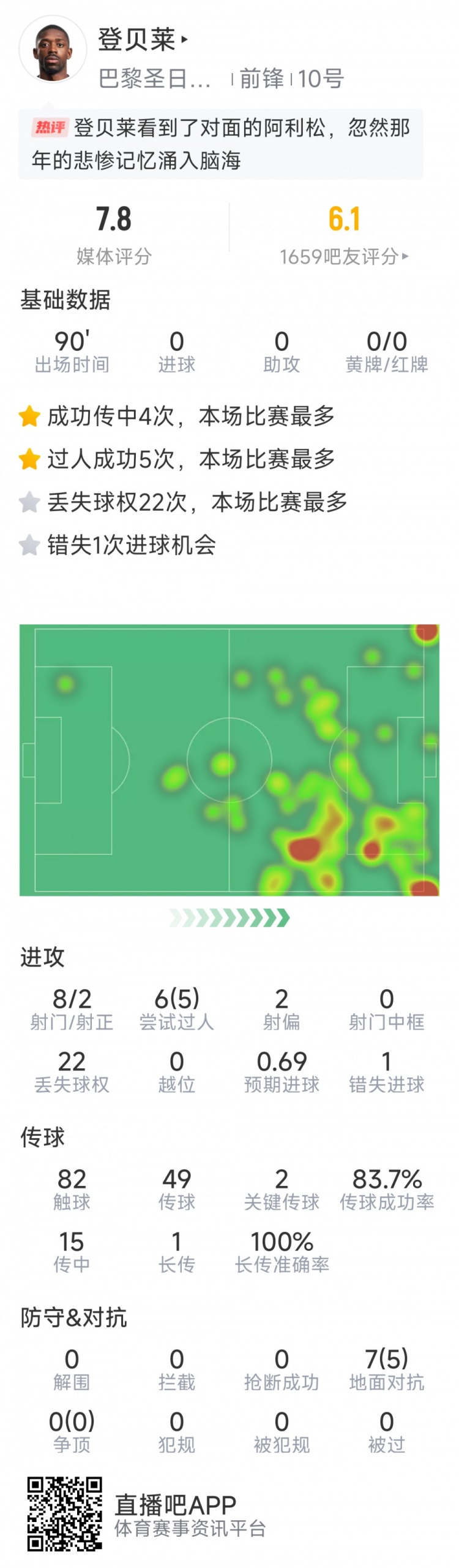 3月6日讯 在本轮欧冠,巴黎0-1不敌利物浦。本场比赛登贝莱首发登场,以下为他在本场数据:比赛时间90分钟8次射门2次射正1次错失良机6次过人5次成功82次触球2次关键传球传球成功率83.7%7次对抗5次成功评分7.8分 本文标签: 足球 法甲 巴黎圣日耳曼