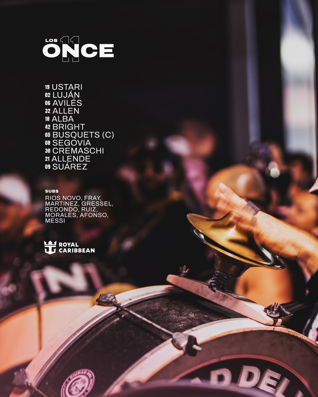 迈阿密国际首发:19-乌斯塔里、2-卢扬、6-阿维莱斯、32-阿伦、18-阿尔巴、42-杨尼克-布莱特、5-布斯克茨、8-特拉斯科、30-克雷马斯基、21-阿连德、9-苏亚雷斯