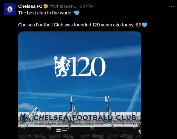切尔西官推表示:“世界最佳俱乐部!切尔西在120年前的今日正式创立!”