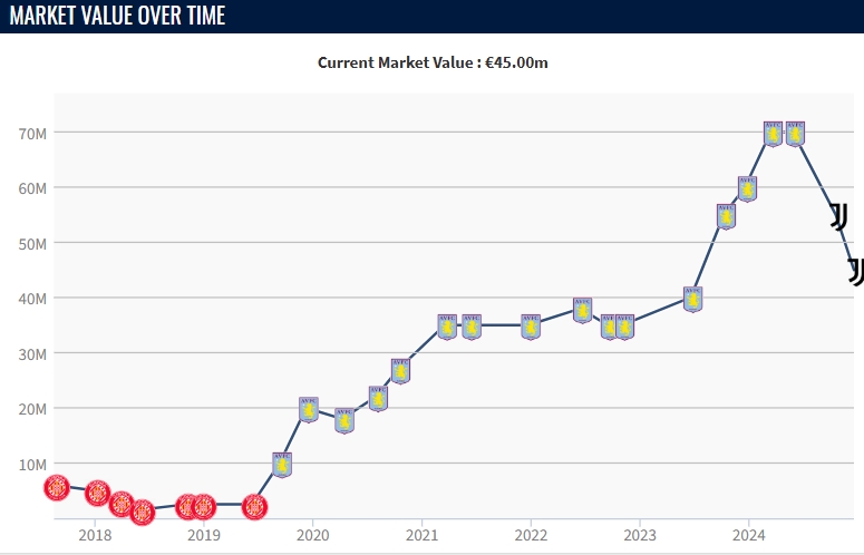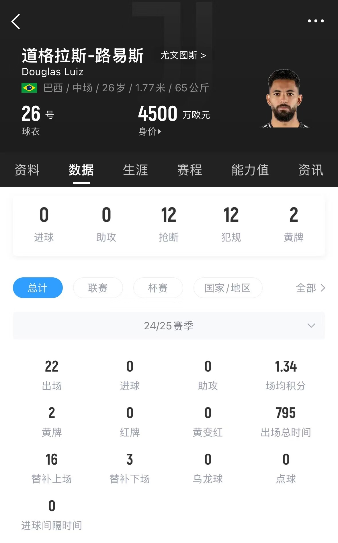 尤文在去年夏天花费5150万欧元从维拉引进这名中场,本赛季他为尤文出战22场比赛,没有取得进球和助攻。值得一提的是,在加盟尤文以后,他的德转身价已由原先的7000万欧元,跌至目前的4500万欧元。