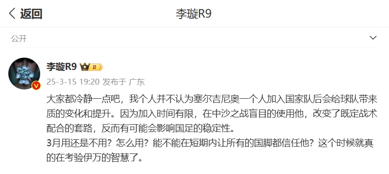 李璇写道:大家都冷静一点吧,我个人并不认为塞尔吉尼奥一个人加入国家队后会给球队带来质的变化和提升。因为加入时间有限,在中沙之战盲目的使用他,改变了既定战术配合的套路,反而有可能会影响国足的稳定性。