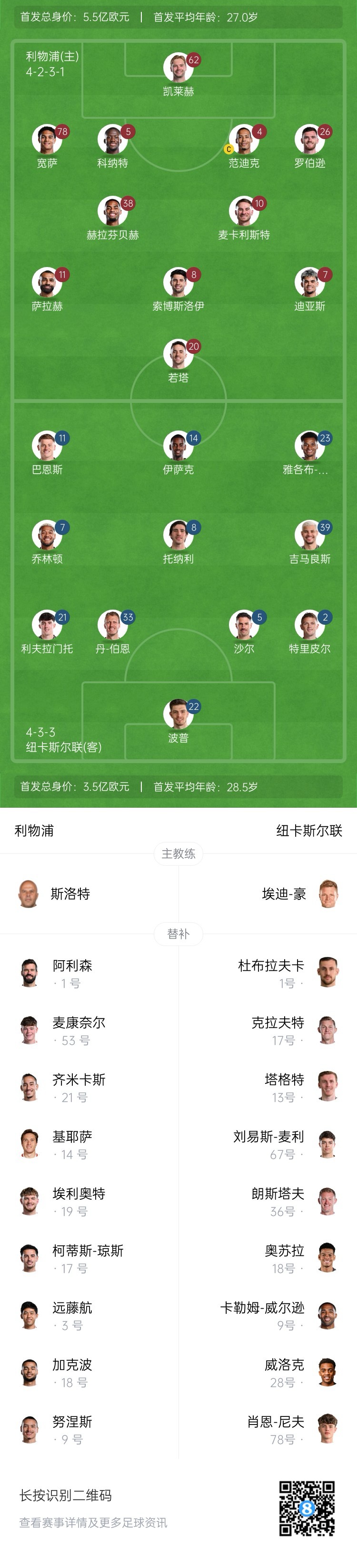 利物浦首发:62-凯莱赫、78-宽萨、5-科纳特、4-范迪克、26-罗伯逊、38-赫拉芬贝赫、8-索博斯洛伊、10-麦卡利斯特、11-萨拉赫、7-迪亚斯、20-若塔