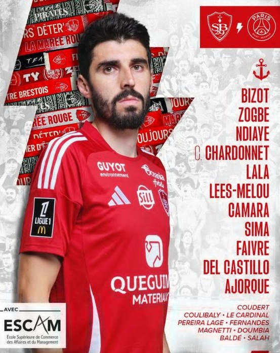 布雷斯特首发:40-比佐特、12-佐格贝、3-恩迪亚耶、5-沙尔多内、7-拉拉、20-里斯-梅洛、45-卡马拉、17-西玛、21-法夫雷、10-卡斯蒂略、19-阿约克