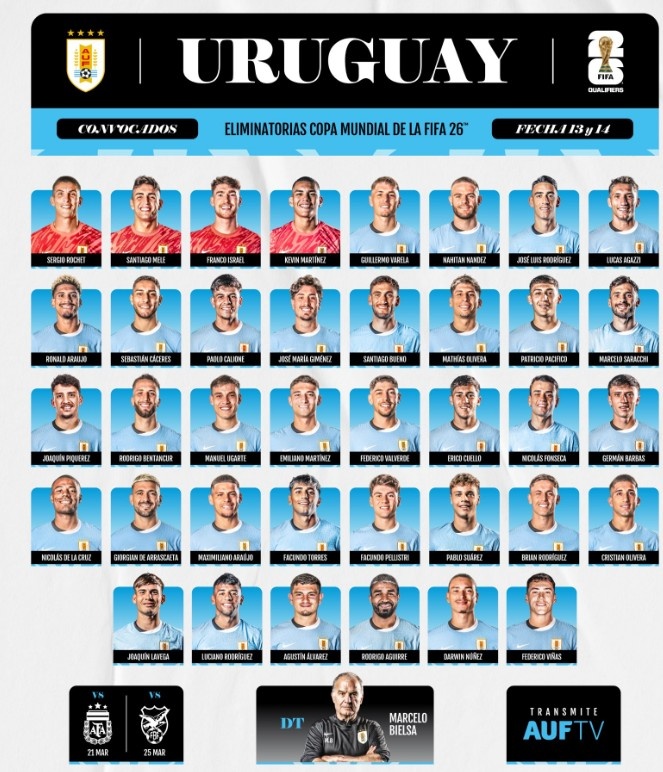 3月19日讯 为了迎接即将到来的对阵阿根廷和玻利维亚的比赛,乌拉圭国家队公布了新一期的大名单,努涅斯、乌加特、本坦库尔、巴尔韦德入选。