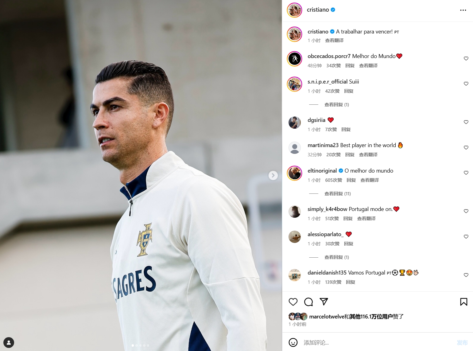 3月19日讯 不久前,正在葡萄牙国家队备战的C罗更新了社交媒体。C罗晒出了自己的训练照,配文写道:“为了胜利而工作!”本期国家队比赛日,葡萄牙将会迎来欧国联1/决赛,将在3月21日和3月24日的客场和主场对阵丹麦队。 本文标签: 足球 利雅得胜利 国家队 葡萄牙 C罗
