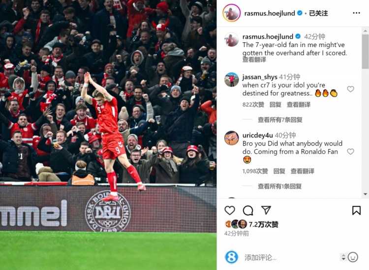 3月21日讯 欧国联1/4决赛首回合比赛,霍伊伦破门,帮助丹麦主场1-0击败葡萄牙。霍伊伦进球后做出C罗标志性的siu庆祝动作,赛后他表示自己从2009年起就是C罗的球迷,并没有冒犯C罗的意思。霍伊伦在社交媒体上晒出自己庆祝的照片,配文:“藏在我心里的那个7岁小球迷,进球后可能接管了我。” 本文标签: 足球 C罗 英超 曼联 丹麦 葡萄牙