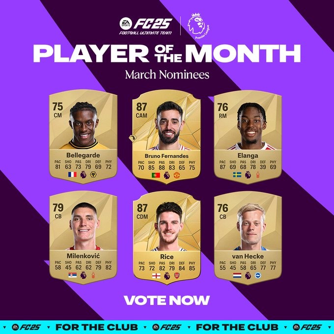 3月27日讯 英超联赛今天公布了3月份最佳球员候选名单,B费、赖斯领衔。