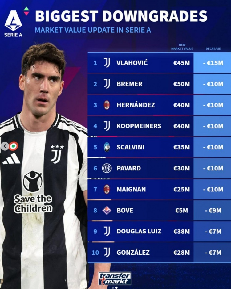 3月30日讯 德转此前更新了意甲球员身价,并盘点了此次更新身价下跌最多的前十榜单,其中弗拉霍维奇居首,尤文球员在前十中占据5席,具体球员目前身价以及跌幅如下: