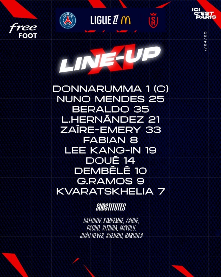1-多纳鲁马,25-努诺-门德斯,35-贝拉尔多,21-卢卡斯-埃尔南德斯,33-小埃梅里,8-法比安-鲁伊斯,19-李刚仁,14-杜埃,10-登贝莱,9-贡萨洛-拉莫斯,7-克瓦拉茨赫利亚