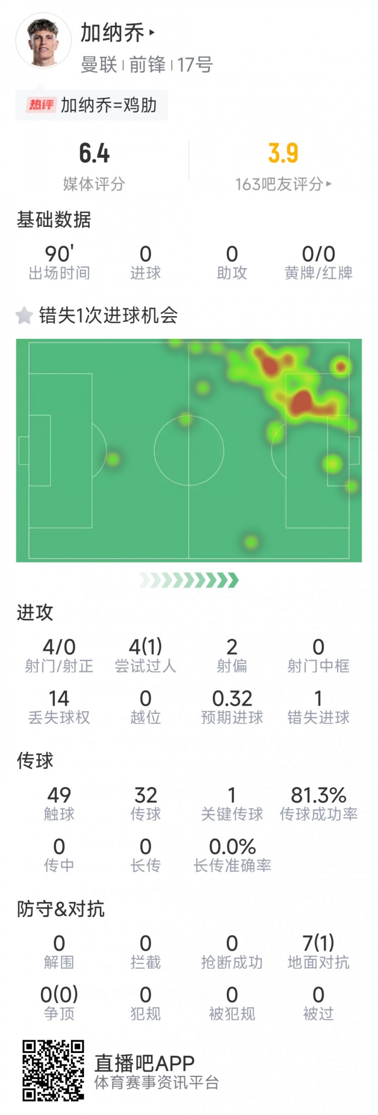 2月3日讯 在本轮英超,曼联0-2不敌水晶宫。本场比赛加纳乔发挥不佳,以下为他在本场数据:比赛时间90分钟3次射门0射正4次过人1次成功1次错失良机49次触球1次关键传球传球成功率78.8%7次对抗1次成功sofa评分6.4分 本文标签: 足球 英超 曼联