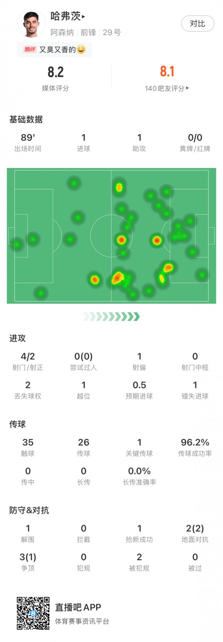 2月3日讯 英超第24轮,阿森纳主场5-1大胜曼城,哈弗茨为枪手首发出战,贡献传射帮球队赢下强敌。哈弗茨全场数据如下:评分8.2出场时间89分钟,进球1次,助攻1次射门4次,射正2次丢失球权2次,越位1次,预期进球0.5,错失进球1次触球35次,传球26次,传球成功率96.2%,关键传球1次解围1次,抢断2次地面对抗2次,均成功争顶3次,成功1次被犯规2次 本文标签: 足球 英超 曼城 阿森纳