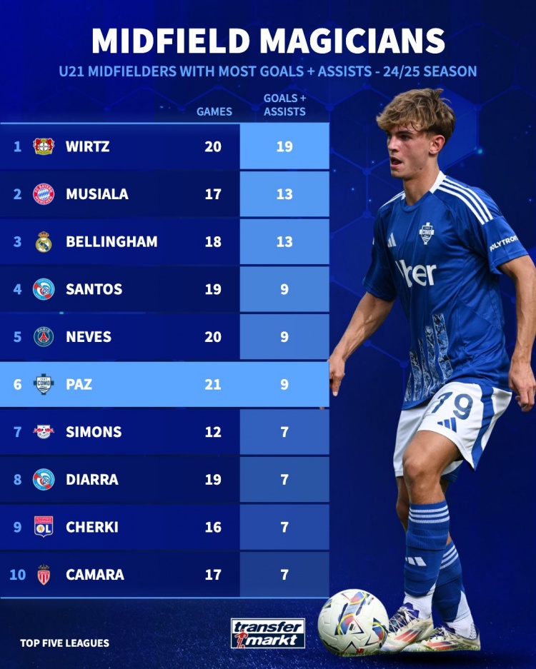 2月7日讯 德国转会市场统计了本赛季五大联赛U21中场参与进球的数量,并列出榜单,维尔茨参与19球居首,尼科-帕斯参与9球排名并列第4位。