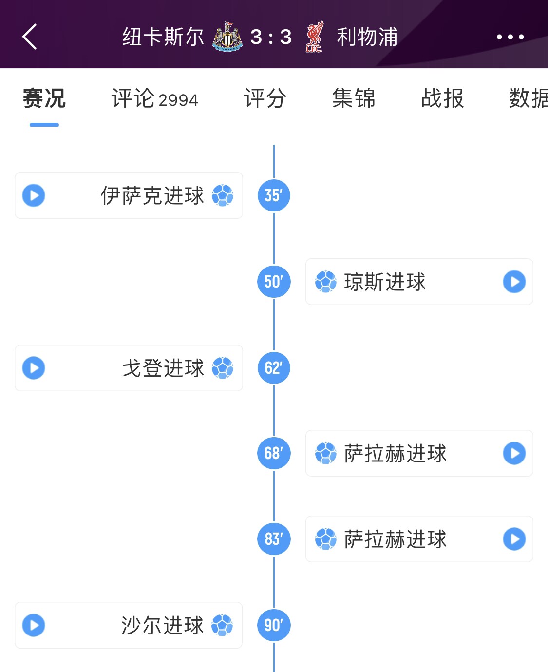 本赛季英超首回合较量,纽卡与利物浦战成3-3。