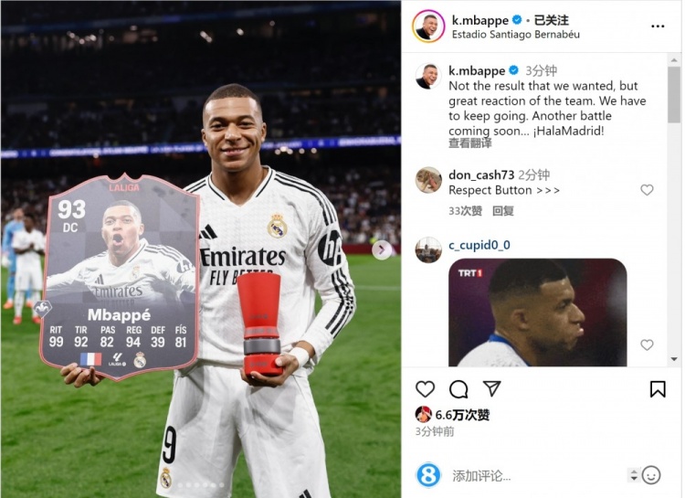 2月9日讯 西甲第23轮比赛,姆巴佩破门,帮助皇马主场1-1战平马竞。姆巴佩社媒晒出自己领取西甲1月最佳球员奖杯的照片,配文:“这不是我们想要的结果,但球队做出了很好的反应。”“我们必须继续前进,另一场战斗即将来临(欧冠对阵曼城)。Hala Madrid!” 本文标签: 足球 西甲 皇家马德里 姆巴佩