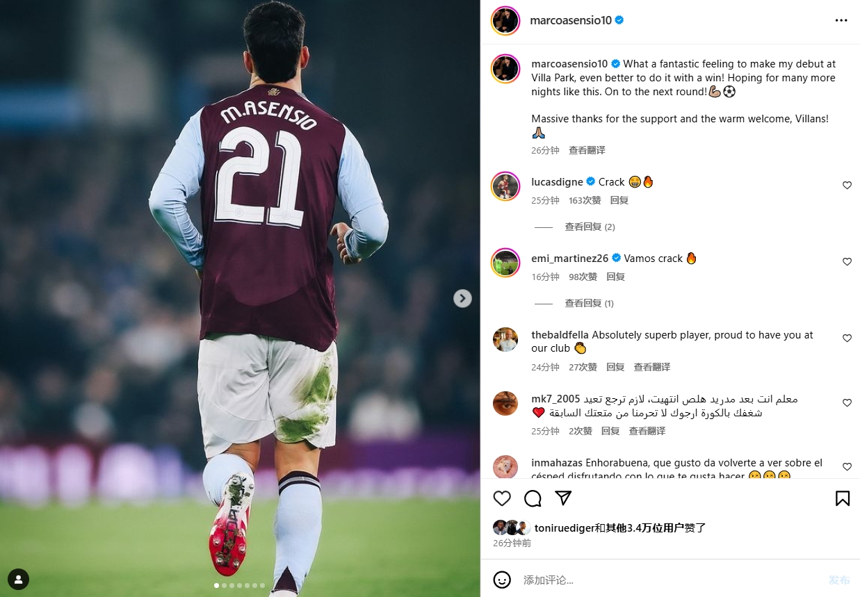 2月10日讯 阿斯顿维拉在本轮足总杯主场2-1击败热刺,从巴黎租借而来的阿森西奥替补完成首秀。他也在赛后通过社媒晒出自己的比赛照,并配文:“在维拉公园的首次亮相真是太棒了,取得胜利让这感觉更好了!期待未来能有更多这样的夜晚。晋级下一轮!????????⚽️非常感谢你们的支持和热烈欢迎,维拉球迷们!” 本文标签: 足球 英超 热刺 阿斯顿维拉 法甲 巴黎圣日耳曼
