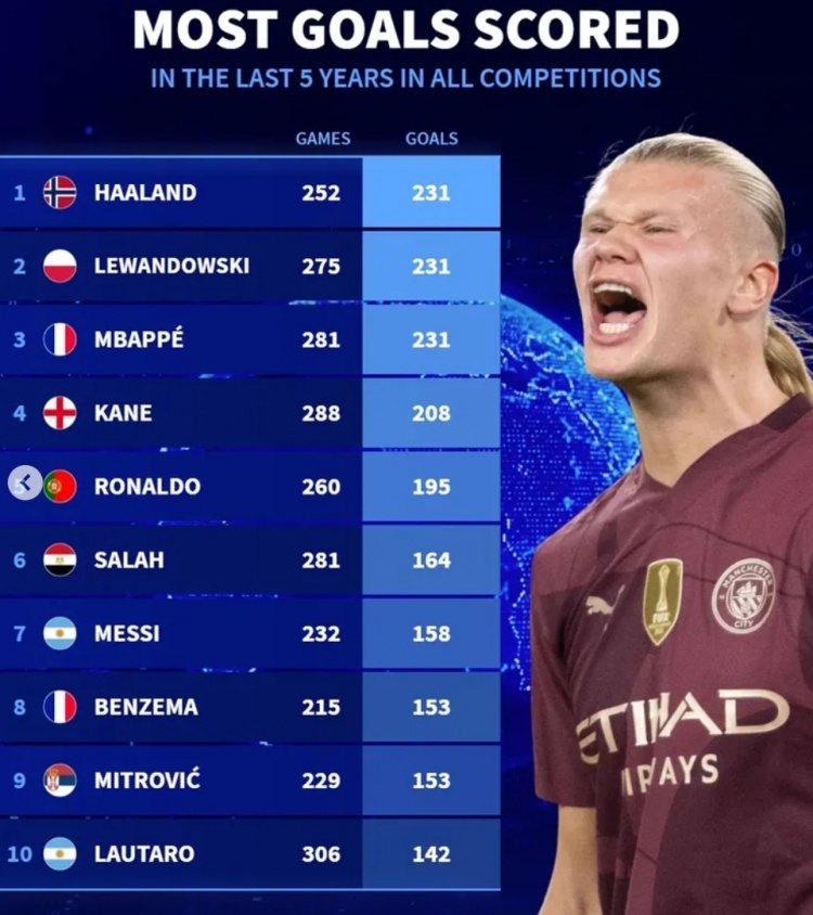 2月11日讯 《转会市场》统计了近5年各项赛事总进球情况,三人并列居首。